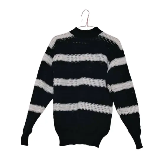 This cozy crochet sweater features bold horizontal black and white stripes, offering a classic and modern contrast. Made with a breathable stitch pattern, it’s designed with a high crew neckline, long sleeves, and ribbed cuffs and hem for a snug fit. Perfect for chilly days, this sweater combines comfort, warmth, and timeless style