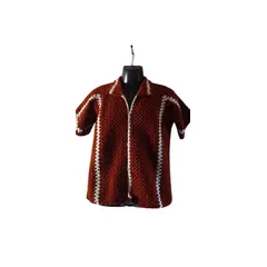 This handmade brown crochet shirt features a short-sleeve design, crafted with a textured stitch pattern. It includes vertical and horizontal white detailing along the front, sleeves, and collar edges, giving it a stylish and structured look. The shirt is buttoned down the front, making it...