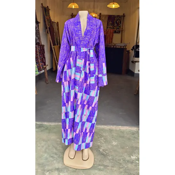 Step out in style with this beautifully crafted Ankara Cotton Kimono. Made in Rwanda, this unique piece blends vibrant African prints with everyday comfort. It comes with a matching belt and convenient side pockets—perfect for effortless elegance at home or on the go.
