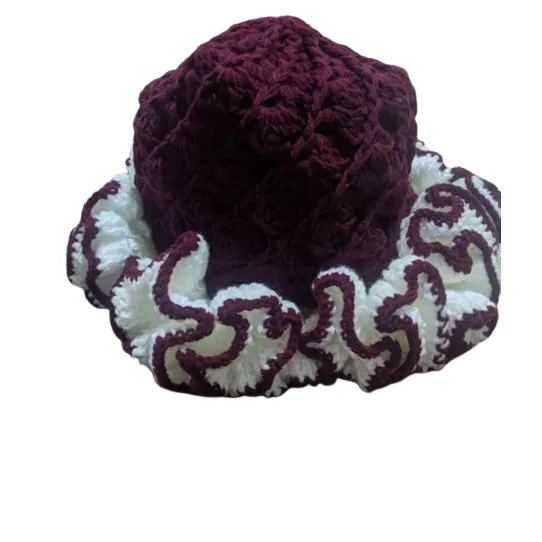 A stylish handmade crochet hat in deep maroon with a beautifully. Soft, cozy, and elegant, perfect for both fashion and warmth and its available in difference color.