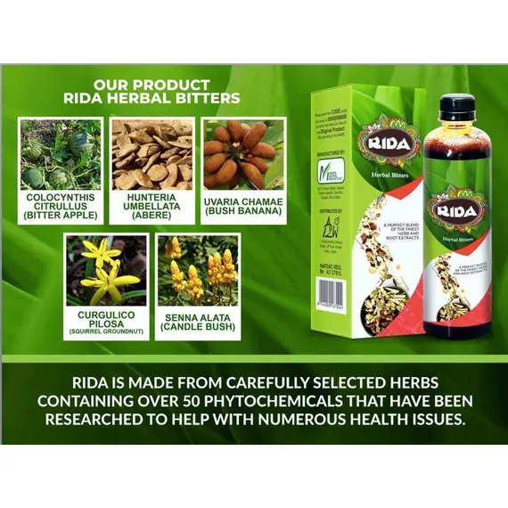 RIDA is proudly made in Nigeria with herbs that are exclusively of western origin and have been proven to help with general well being as well as helping to manage many body ailments with testimonies ranging from diabetes, high blood pressure, high cholesterol, obesity, weak erection, low libido, infertility, etc.