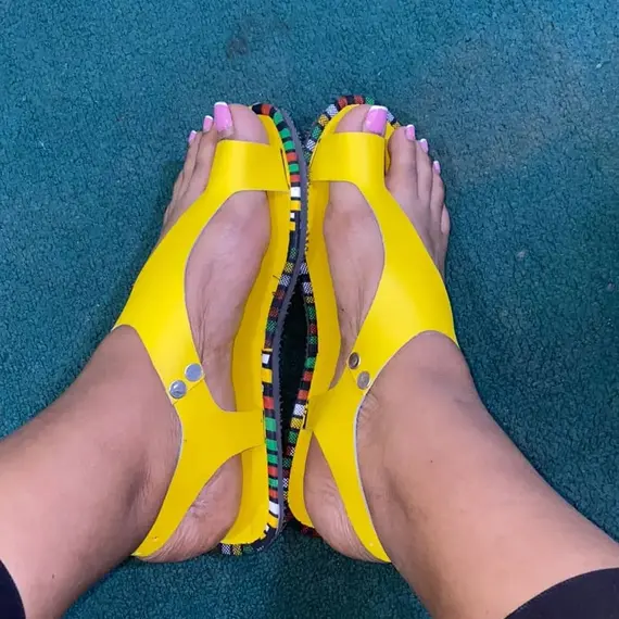 - Stylish and trendy women’s sandals featuring sleek yellow leather straps with a chic metal toe ring design, perfect for adding a modern touch to your summer wardrobe.
