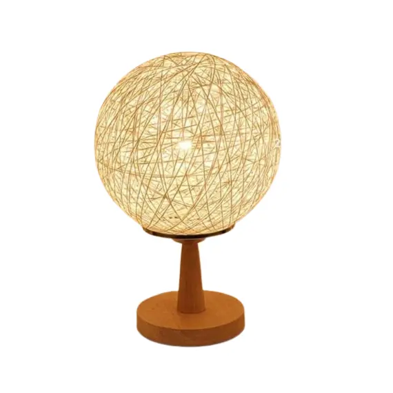 - This small brown table lamp features a stylish wooden globe lampshade, blending mid-century modern design with natural materials for a warm, inviting ambiance.