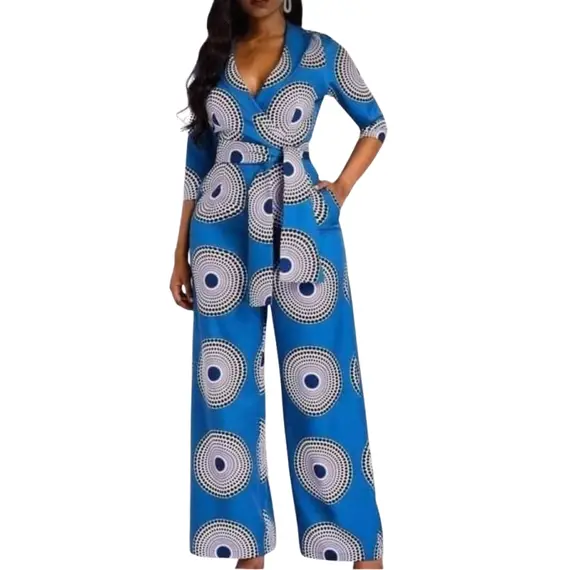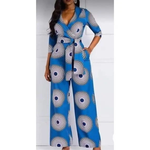Stylish African Design: Features an eye-catching sky blue circle print for a bold and elegant look.One-Piece Suit: Combines the comfort of a jumpsuit with the professionalism of a business suit.Business Casual: Perfect for work, meetings, and special occasions, blending modern and traditional fashion.Made in Rwanda: Crafted with high-quality Kitenge fabric, supporting local artisans.Comfortable Fit: Designed for ease and comfort throughout the day while maintaining a polished appearance.