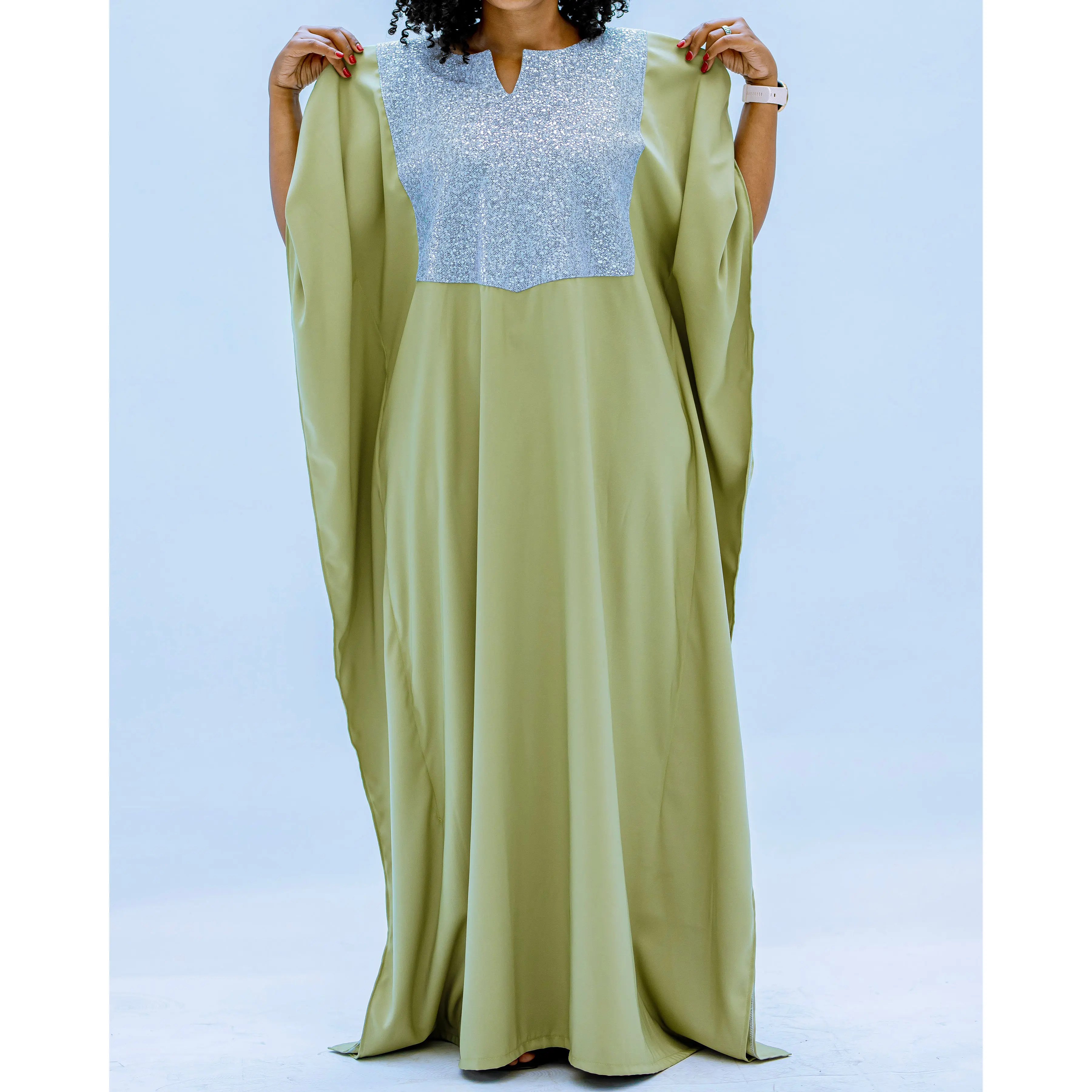 Elegant light green kaftan dress with a stylish metallic mesh square neck.Perfect for a wide range of occasions: dating, weddings and vacations.Made from soft, cozy fabric, ensuring a comfortable wearing experience.The fabric has a luxurious feel, adding sophistication and charm.Designed to flatter the figure with its carefully crafted cut and shape, accentuating your curves.